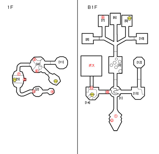 分岐路から[3]に戻ってきて、B1Fへ。どの穴から落ちても良い。