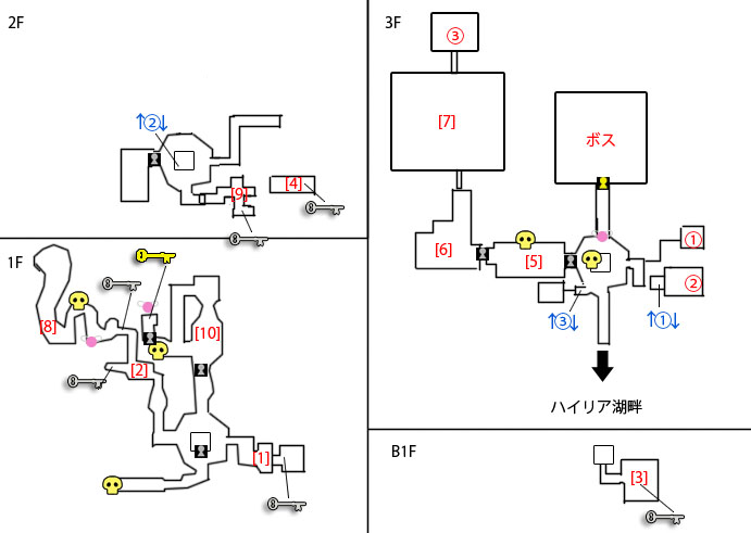 3Fに戻ったらヘビィブーツを履き、ルトのいた[1]から3Fまでのぼり、石版↑①↓を使って水位を1Fにする。