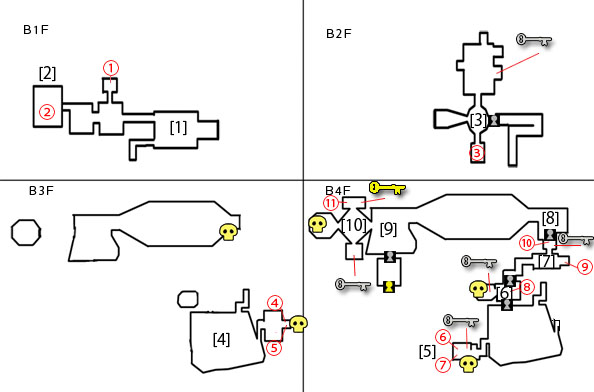 ダンジョン攻略チャート 序盤 B1Fの入り口から入り、ロングフックとまことのメガネを使って進み、[1]に出たら北の小部屋まで行く。