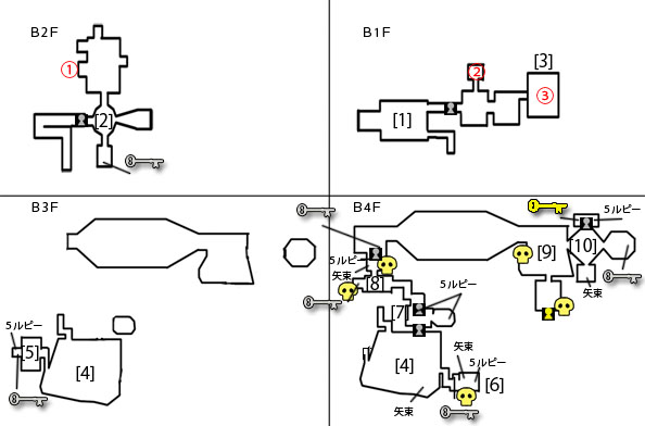 十字路から南の部屋の敵を倒して小さなカギを入手。[1]にもどる